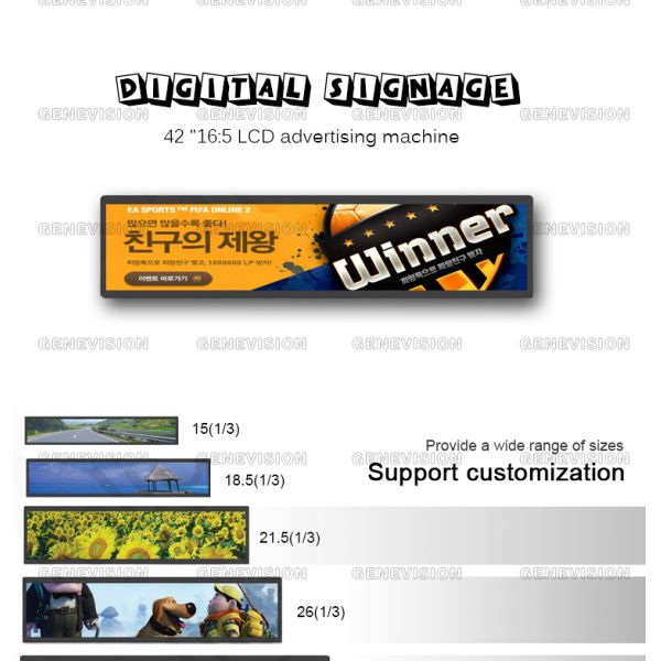 2.Digital stretch display can help your business in many ways from altering consumer behaviors at the point of sale, enhancing your brand, scheduling your promotions during peak periods, managing your signage from a central location to increasing cross-selling and up-selling opportunities.
